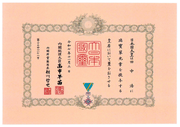 この度、令和7年11月3日に弊社 代表取締役社長 田中 浩が瑞宝単光章を叙勲受章しました。 これからも益々精進いたします。 今後とも どうぞよろしくお願いいたします。 ![]() ![]() |